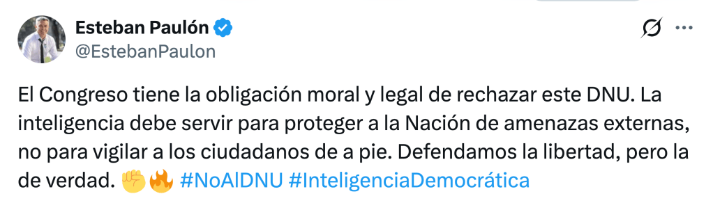 Se trata de un nuevo golpe al consenso democrático, que en lugar de un sistema de inteligencia sometido a límites y controles pretende implantar una suerte de policía secreta con capacidad de detención de personas, tironeada por las fuerzas contrapuestas de la interna oficial y con poder suficiente para limitar la libertad de expresión y la disidencia.