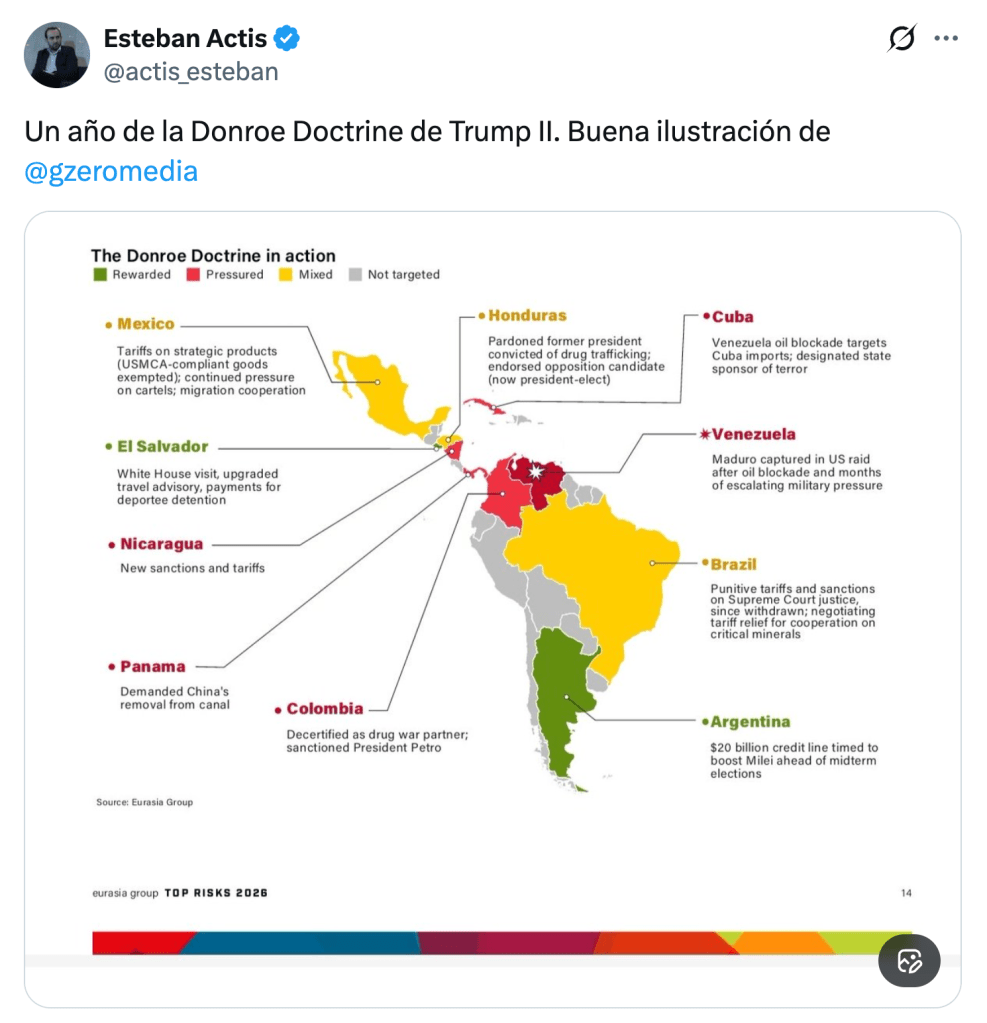El alineamiento forzoso de la región comenzó mucho antes del fuego en Venezuela y tuvo forma de aranceles punitivos, injerencias en procesos electorales e intromisiones financieras –como en Argentina–, desplazamientos de fuerzas navales y ataques a presuntas narcolanchas que dejaron más de un centenar largo de muertes. Colombia y Brasil, que celebrarán elecciones presidenciales en mayo-junio y octubre-noviembre, respectivamente, serán los próximas estaciones de la ofensiva.