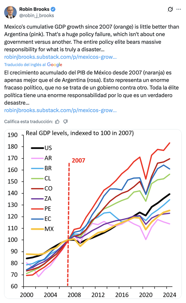 A pesar de su larga asociación con Estados Unidos, México atraviesa una década de bajo crecimiento y mantiene un nivel de pobreza del 30%. Este ha descendido con fuerza recién desde 2018, cuando Andrés Manuel López Obrador la había recibido en más de 41%. La causa de ese éxito relativo fueron las políticas sociales del mencionado y de su sucesora, Claudia Sheinbaum, no el libre comercio per se.