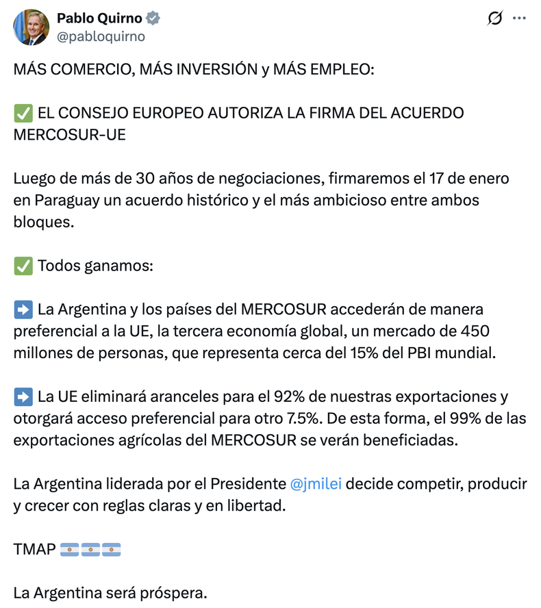 La apertura comercial es un elemento crucial de la vocación ideológica del presidente argentino, contrapunto llamativo en su admiración y alineamiento con Trump. Como los efectos del entendimiento se irán sintiendo con el tiempo –incluso en años–, el panorama final de la relación comercial con Europa probablemente se conocerá cuando el mileísmo ya sea historia.