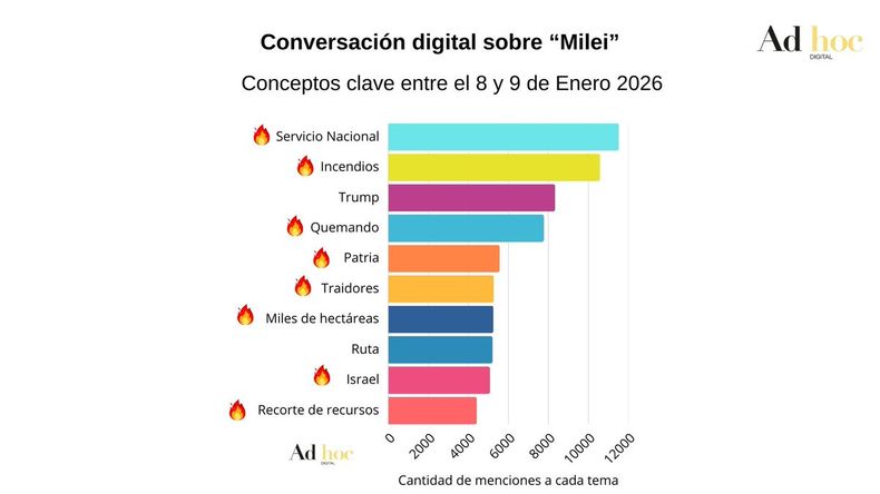 Según la consultora Ad Hoc, entre el jueves 8 y el viernes 9, «ocho delos diez conceptos más relacionados con Milei se refirieron a los incendios, lo que indica una relación directa del tema con su figura». Mala noticia.
