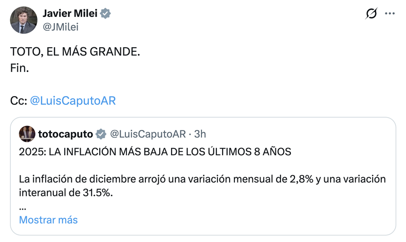 Como se esperaba, la inflación de diciembre prolongó, por decimoquinto mes, la maldita meseta del «dos y pico», encima con un número –2,8%– peor que el esperado, hecho revelador de la enorme dificultad que encuentra Toto Caputo para hacerle cumplir a Javier Milei la promesa de un IPC que comience con cero entre junio y, «como máximo», agosto próximos.