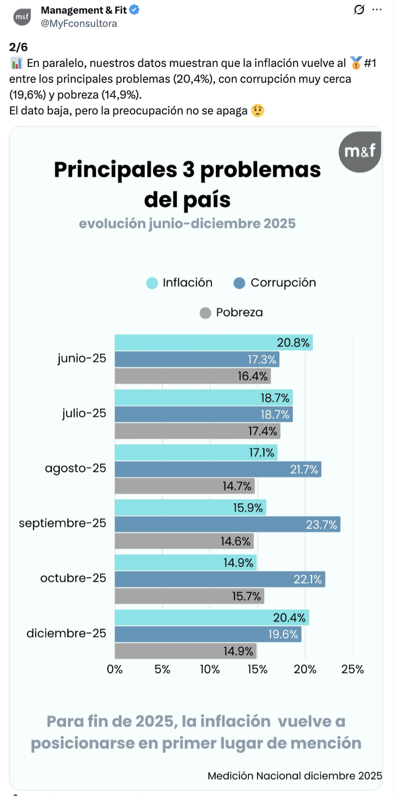 El IPC del dos y pico, que sólo bajó fugazmente entre mayo y agosto últimos, constituye un problema político de primer orden, toda vez que la consigna «la plata no me alcanza» salta de nuevo al tope de las principales preocupaciones ciudadanas medidas en las encuestas. En ese sentido, Management & Fit registró en diciembre un salto importante de la inquietud por los aumentos de tarifas y precios en general.