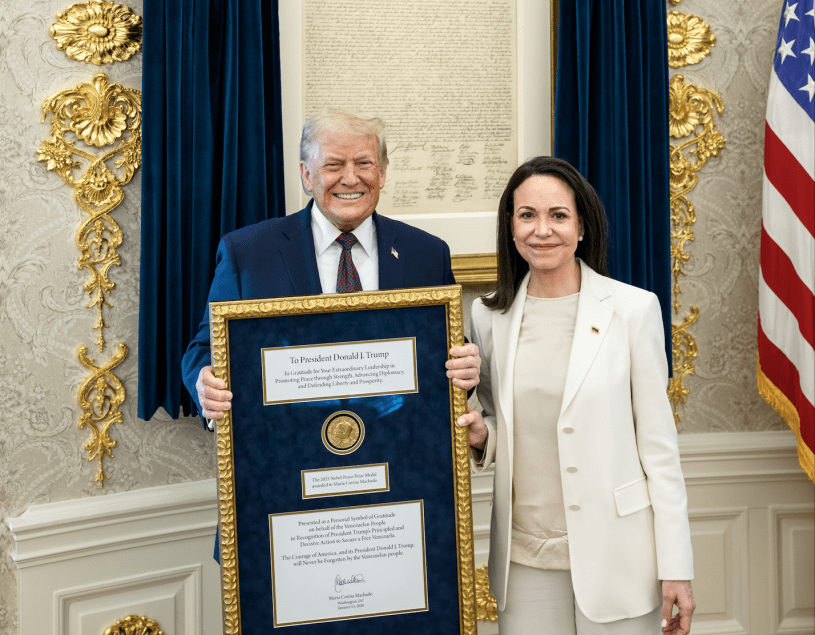 «En gratitud por su extraordinario liderazgo en la promoción de la paz mediante la fortaleza, el impulso de la diplomacia y la defensa de la libertad y la prosperidad», dice el mensaje enmarcado y que, a su vez, le dio marco al galardón. «Presentado como un símbolo personal de gratitud en nombre del pueblo venezolano, en reconocimiento a las acciones firmes y basadas en principios del presidente Trump para asegurar una Venezuela libre. El coraje de Estados Unidos, y de su presidente Donald J. Trump, nunca será olvidado por el pueblo venezolano», añadió.