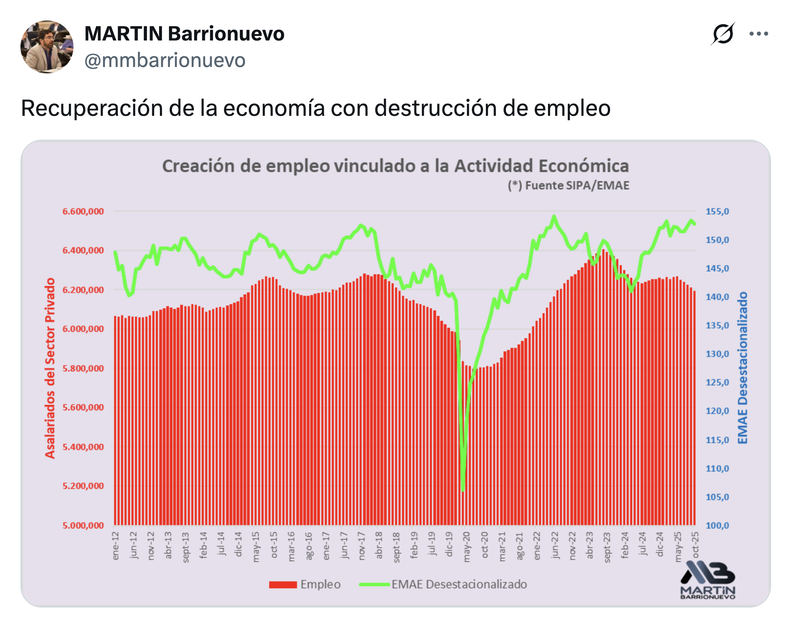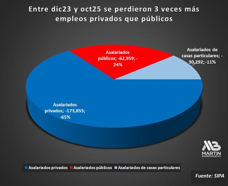 En tanto, desde la asunción del anarcocapitalista se perdieron en total 270.852 empleos, 176.908 de los cuales pertenecían al sector privado, 63.132 al público y 30.812 a casas particulares. El mundo pyme es una víctima predilecta del modelo.