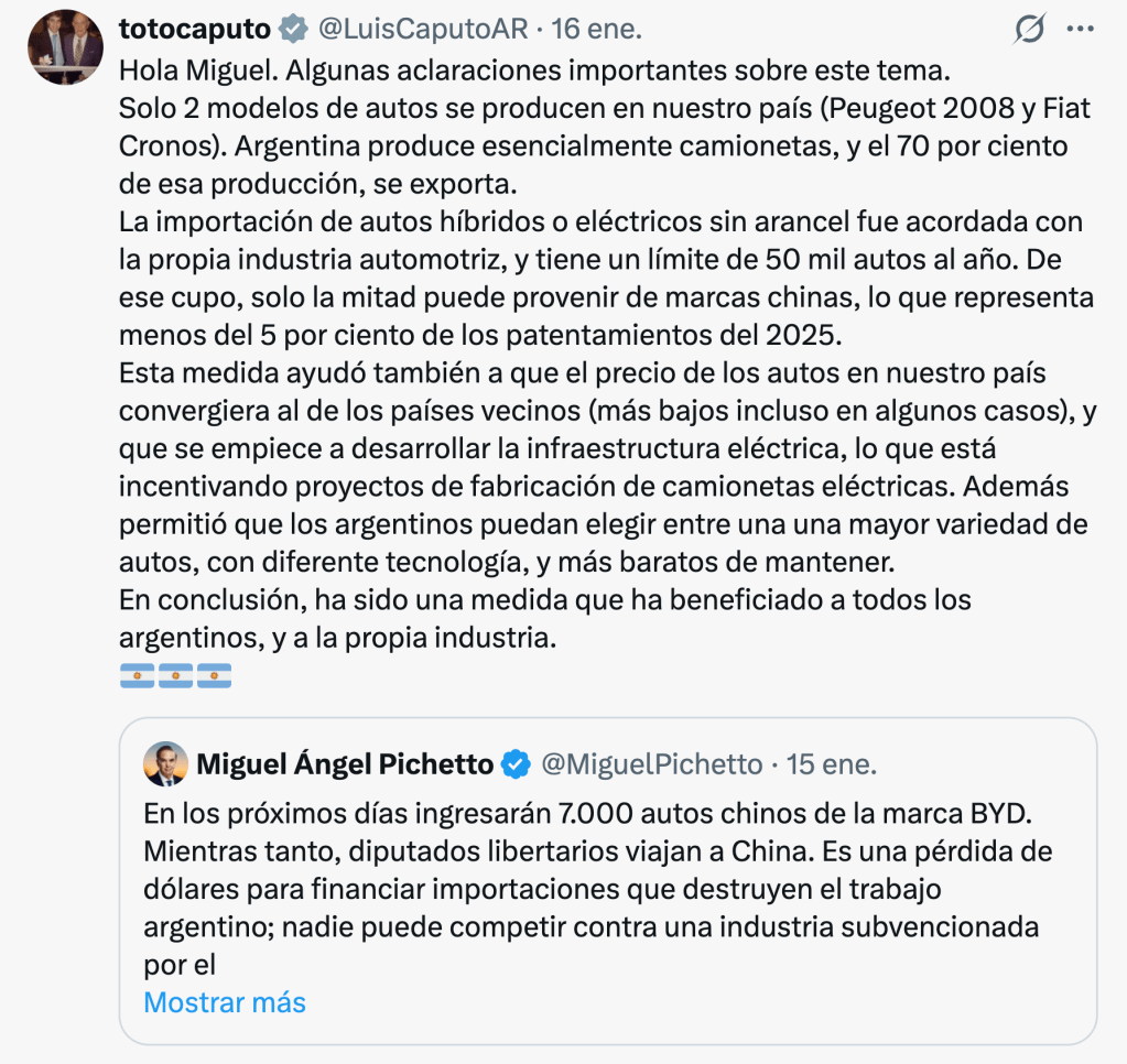 Mientras, Toto Caputo debió explicarle a Miguel Ángel Pichetto –más proteccionista y más trumpista– por qué permitirá el ingreso de un cupo de automóviles eléctricos e híbridos de ese país.