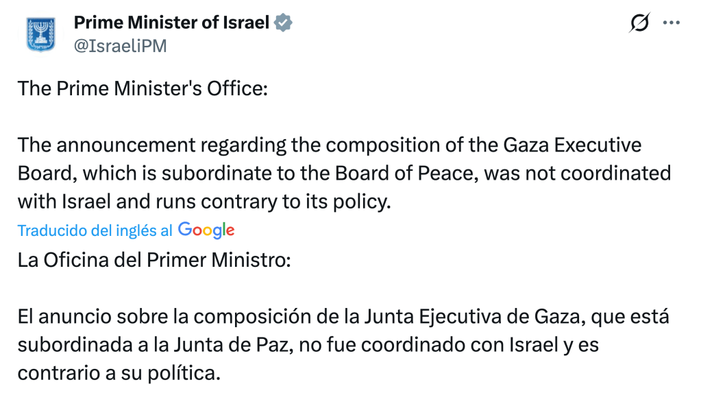 Como ya le pasó con el entusiasmo por Ucrania, también en este punto a Milei se le desinflan la euforia y el ego. Benjamín Netanyahu se opone a la Junta, cuyo primer objeto de atención será la paz en Gaza. Denuncia no haber sido consultado, teme la influencia que los países musulmanes convidados puedan ejercer a favor de Hamás y, sobre todo, no acepta la actuación de ningún organismo que se adjudique poder de decisión en la Franja.