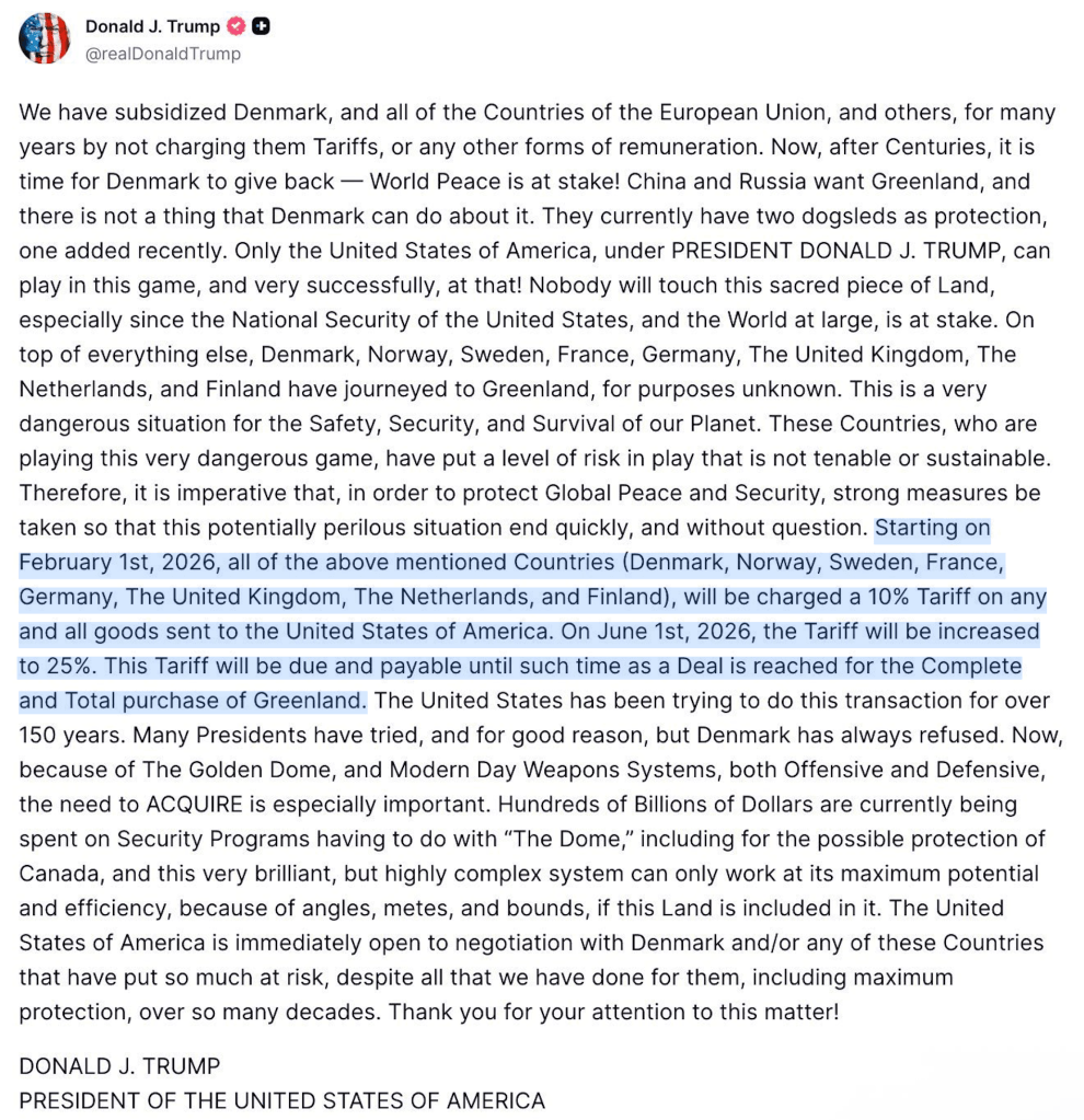 Ante la negativa de la UE a humillarse completamente –por ahora, al menos–, Trump anunció la imposición desde el 1 de febrero de aranceles del 10% –adicionales al 15% que ya había aplicado en abril, al lanzar su guerra comercial– a todos los productos de ocho países: Dinamarca, Alemania, Francia, Noruega, Suecia, Países Bajos y Finlandia, además del extracomunitario y hasta ayer nomás aliado «especial», el Reino Unido. Es más, si no ceden, el 1 de junio el arancel punitivo escalará al 25%.