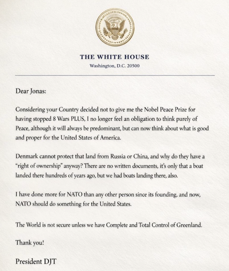 En un hecho insólito, este lunes le hizo llegar una carta a Jonas Gahr Store, primer ministro de Noruega, al que le dijo que la decisión de ese país –otro de los sancionados– de no concederle el Premio Nobel de la Paz lo libera de ataduras para apropiarse de Groenlandia. La psiquiatría deviene ciencia auxiliar de la política.
