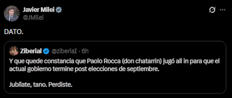 El Presidente lo definió como «Don Chatarrín» en las redes y como «una ‘piedra’ en el camino» en el Derecha Fest, sin nombrarlo, acaso por desdén, acaso por cierto temor. Este jueves subió la apuesta: replicó un mensaje en el que acusan al empresario de conspirar contra el Gobierno.