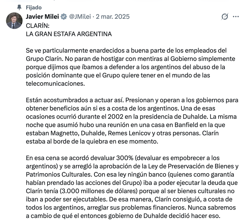 El Presidente, que ahora embiste contra «Don Chatarrín», mantiene fijado en Twitter un mensaje lleno de reproches y cargos contra el «monopolio Clarín».