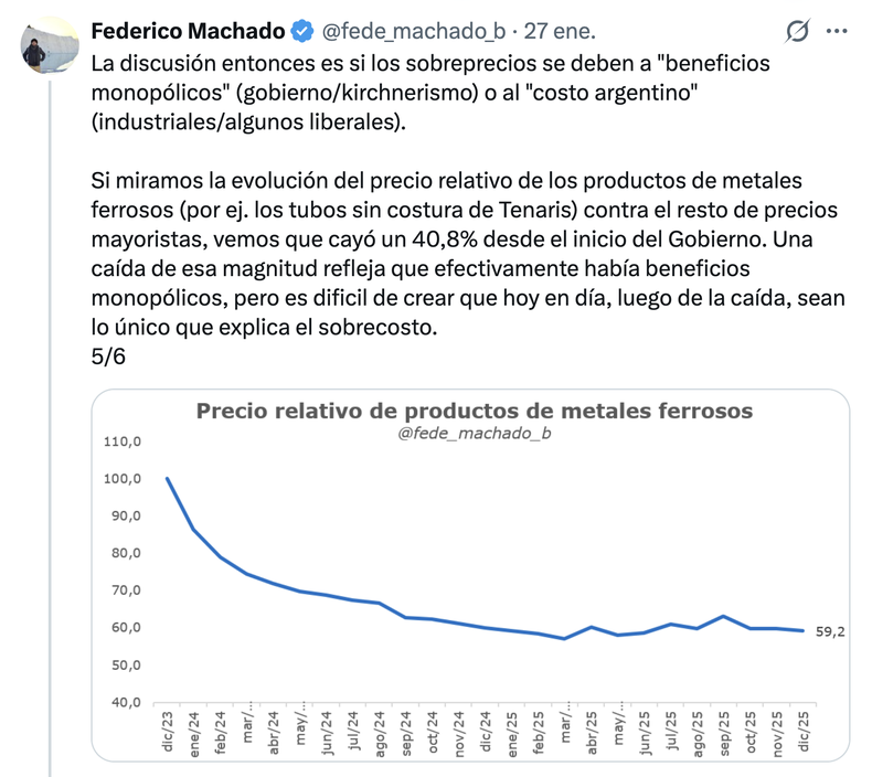 En un hilo interesante, el economista Federico Machado llegó a la conclusión de que «la derrota de Techint sugiere que el problema hoy es estructural. Si a pesar de la caída en los precios relativos, la industria nacional sigue fuera de mercado, la causa ya no es solo el margen de ganancia, sino un país que sigue siendo caro para producir».