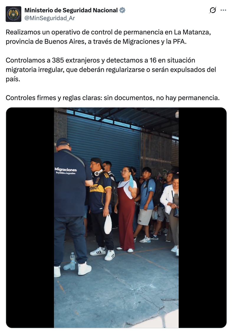 Los rostros que muestra podrían ser de gente que estaba en situación regular o no. Asimismo, uno de los responsables de las redes de Milei, Iñaki Gutiérrez, se descolgó con un video personal en Instagram en el que anunció, con voz marcial: «¡Último momento! El 70% de los habitantes de las villas argentinas son extranjeros que entraron de forma ilegal al país y hay que echar inmediatamente».