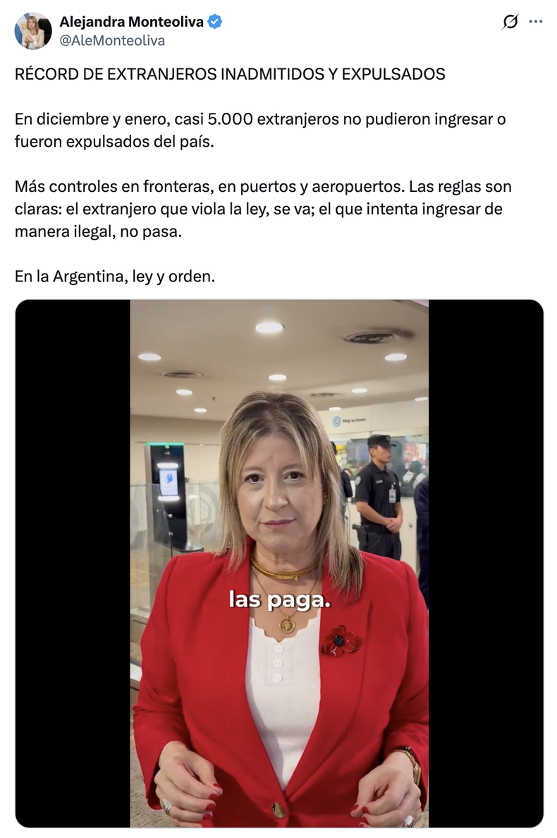 «En diciembre y enero, casi 5000 extranjeros no pudieron ingresar o fueron expulsados del país (…). El extranjero que viola la ley se va; el que intenta ingresar de manera ilegal no pasa», sacó patente de guapeza la ministra de Seguridad, Alejandra Monteoliva.