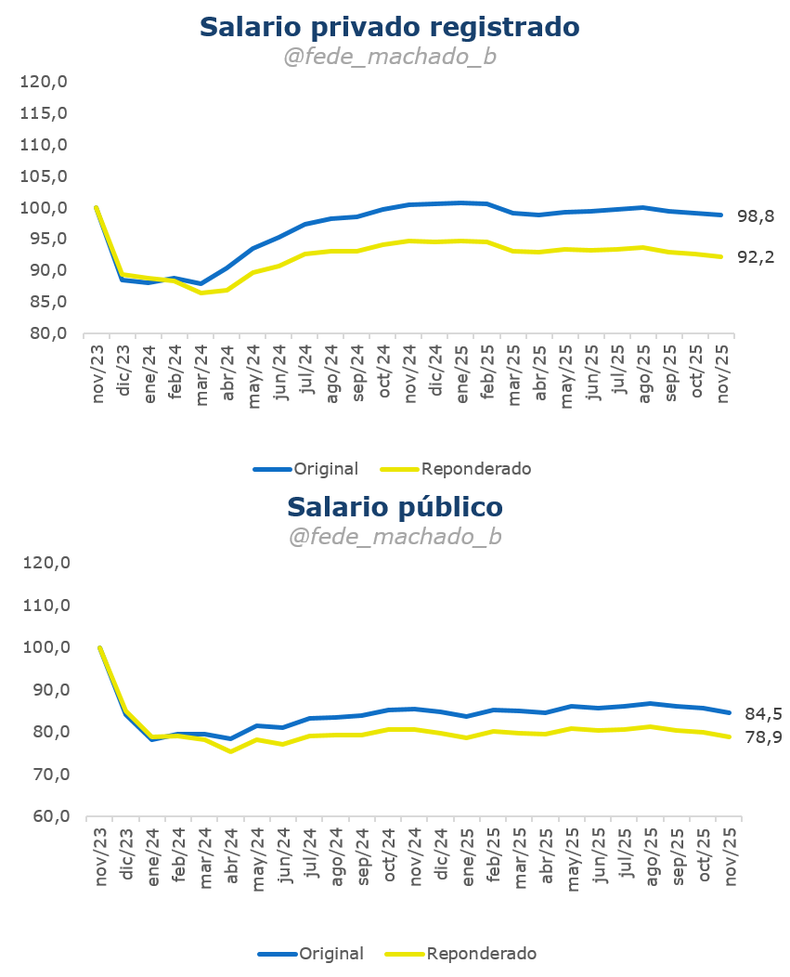 «Si miramos el salario deflactado por el IPC original, no hay ancla salarial: los registrados se mantienen aproximadamente en niveles de noviembre de 2023, los no registrados están un 16% por encima y sólo el sector público pierde. Pero, si ajustamos por el IPC reponderado, el panorama cambia bastante: los registrados pierden 7,8% de su ingreso real, los no registrados ganan un 7% menos y los trabajadores públicos pierden 5,6% adicional», añadió.