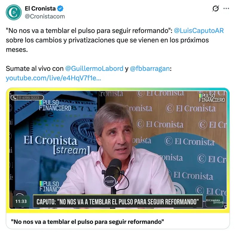 Por otro lado, señaló en una entrevista con el streaming Pulso Financiero, de El Cronista, que el dólar seguirá cotizando entre bandas y bajo control, con estabilidad y compra de reservas para el Banco Central, y con reducción del riesgo soberano. Para el hombre, como para su pariente Santiago Caputo, dueño de la narrativa 2027, basta con mentar el «riesgo kuka» para que todo en la vida, incluso la resiliencia de una inflación que –se suponía– ya debería estar «pulverizada», cobre sentido.