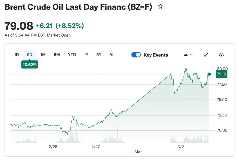 Tras una escalada inicial del 9%, el crudo WTI –de referencia en Estados Unidos– finalizó a casi 72 dólares por barril –7% arriba– y el del mar del Norte, el Brent –referencia para el hidrocarburo argentino– subió 8,5% hasta más de 79 dólares.