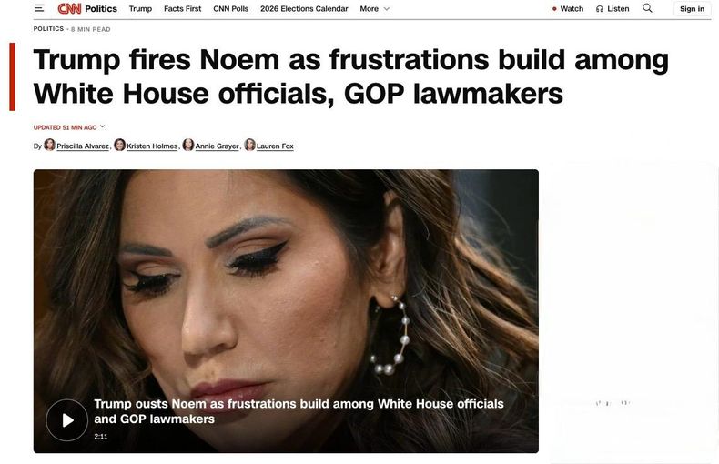 No hay que engañarse: el hombre está preocupado y, pese al aura de autoridad que intenta emanar, no puede evitar responder a crecientes presiones de sus propios legisladores y candidatos. Este jueves, sorprendió la noticia de la eyección de su secretaria –ministra– de Seguridad Interior, Kristi Noem, quien fue una de las caras visibles de la desastrosa, violenta y piantavotos ofensiva antiinmigrantes desatada en Minnesota y otros estados demócratas. Entre otros escándalos…