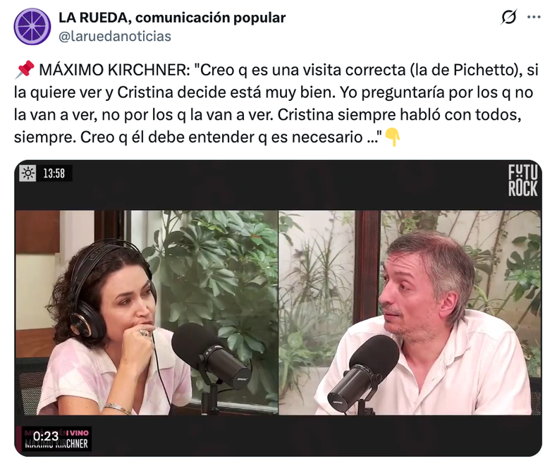 Consultado en Futurock sobre esa visita llamativa, Máximo Kirchner aprovechó para gambetear y arrojarle un dardo a uno que no ha pasado por el departamento de Constitución: Axel Kicillof.