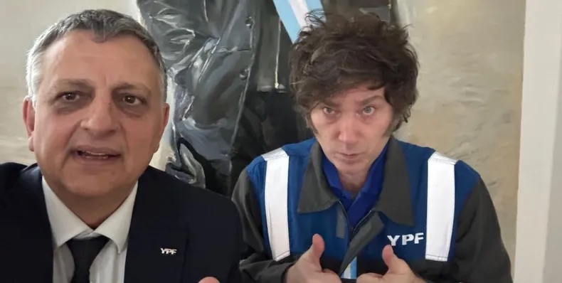 El ceo de YPF, Horacio Marín, y Javier Milei, con su mameluco de la petrolera. (Captura de redes).
