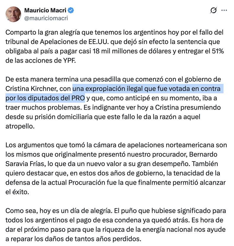Sin embargo, en el mismo posteo calificó la expropiación de «ilegal» y de «atropello», a la vez que recordó con orgullo que «fue votada en contra por los diputados del PRO». Quien alguna vez pretendió encarnar un centroderecha democrático habla de YPF, pero no de $LIBRA ni de Manuel Adorni.