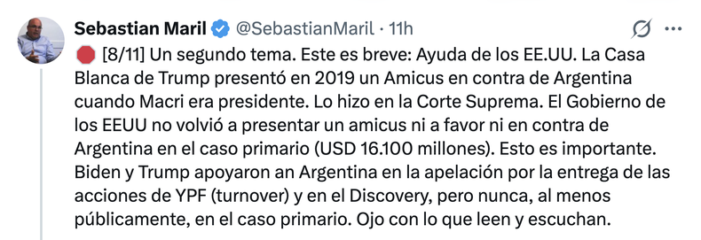 Además de peligroso, eso es falso: Trump no ayudó a la Argentina en el fondo de la cuestión, sino sólo en lo que hacía a la ejecución de la sentencia de Preska, recordó el economista Sebastián Maril, uno de los observadores más atentos de ese y otros juicios contra el país.