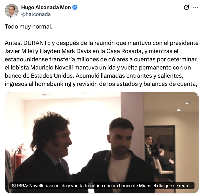 «Antes, durante y después de la reunión que mantuvo con el presidente Javier Milei y Hayden Mark Davis en la Casa Rosada, y mientras el estadounidense transfería millones de dólares a cuentas por determinar, el lobista Mauricio Novelli mantuvo un ida y vuelta permanente con un banco de Estados Unidos. Acumuló llamadas entrantes y salientes, ingresos al homebanking y revisión de los estados y balances de cuenta, según reconstruyó La Nación en base al material que expertos informáticos de la Dirección de Apoyo Tecnológico a la Investigación Penal (Datip) recuperaron del teléfono celular del lobista y ‘abrepuertas’ del poder», escribió.