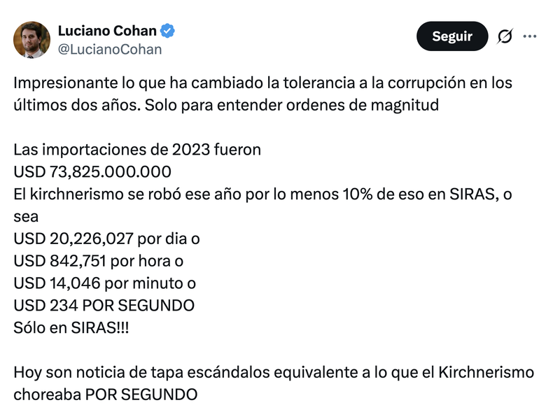 El argumento habla mal de quienes lo esgrimen: cabría preguntarles cuál es su mínimo no imponible de tolerancia a la corrupción. Además, tiene la desventaja de presentar las incorrecciones que se denuncian como acciones de hombres y mujeres que, acaso urgidos por su poca fe en la duración de su propio proyecto, por la cancelación –ajuste mediante– de cajas más grandes como la obra pública o por pura angurria, aparecen ante la opinión pública como gerentes de un maxikiosko polirrubro.