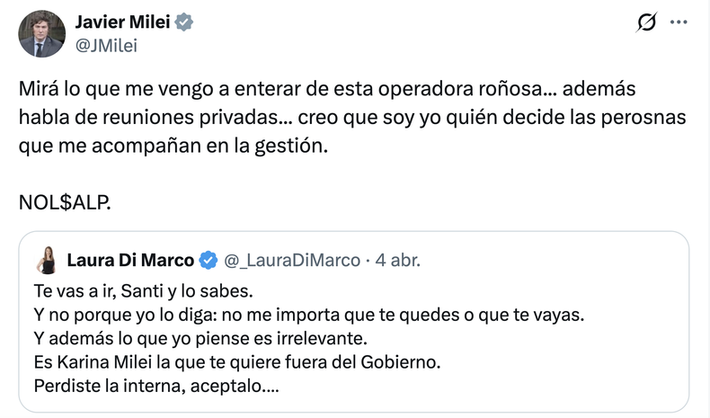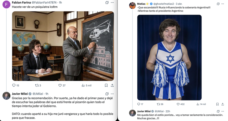 En el medio de ese proceso, Milei se desnuda. Coherente con su idea violentista de lo que debería ser el intercambio de ideas en ágoras como las redes sociales –sobre la propia naturaleza de la política, al fin y al cabo–, insólitamente responde –y legitima– a usuarios que lo tratan de demente, corrupto, enemigo del pueblo que gobierna o traidor a la patria.