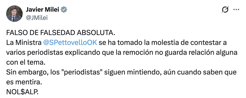 «FALSO DE FALSEDAD ABSOLUTA», gritó Milei en Twitter.