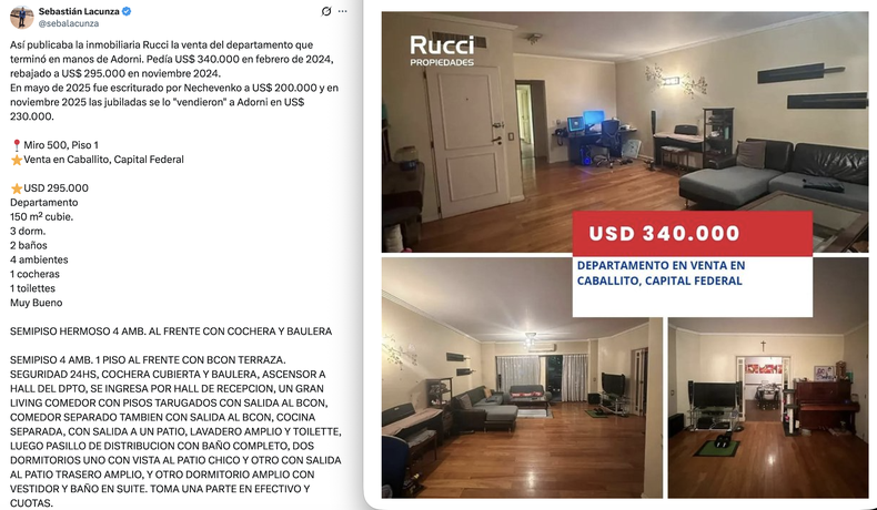 Por otro lado, la incompatibilidad entre el precio de publicación de la propiedad en Caballito y el monto escriturado por Adorni, casi un 33% inferior.