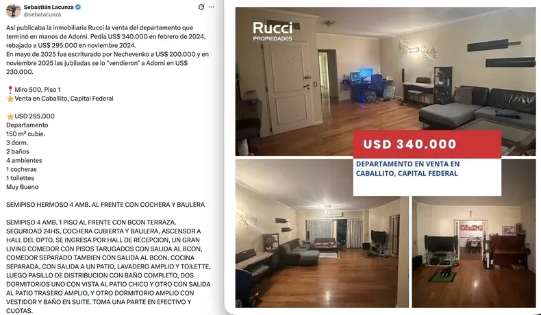 - Sobre los dólares necesarios para honrar esas deudas, señaló que Adorni «los va a sacar de la venta del departamento de Asamblea, que es donde vivía».