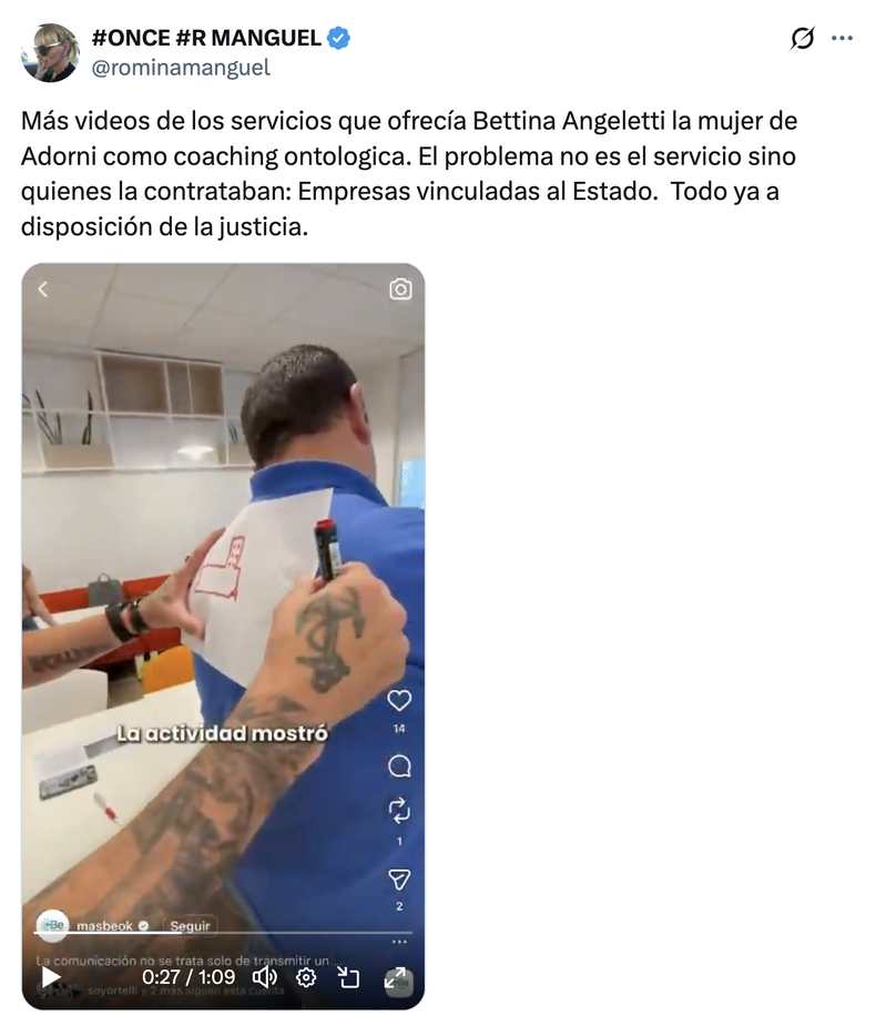 Según posteó la periodista Romina Manguel, «se investigan los contratos de la Consultora +BE, de la mujer de Adorni» por «sospechas de posible conflicto de interés, ya que por lo menos tres serían con proveedores del Estado». El servicio de coaching ontológico que ofrecía valía «seis millones de pesos mensuales».