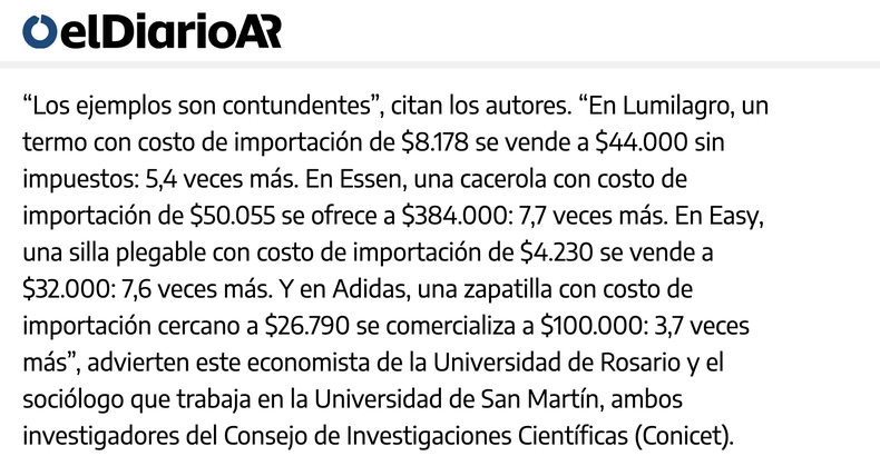 En un interesante artículo publicado en ElDiarioAr, Alejandro Rebossio cita un trabajo del economista Gustavo García Zanotti y el sociólogo Martín Schorr en el Instituto de Pensamiento y Políticas Públicas (IPyPP). Según cuenta, los industriales que surfean el mx de apertura comercial y dólar barato, cierran sus plantas de producción para reciclarse como importadores venden en el país hasta siete veces más caro que lo que pagan afuera.