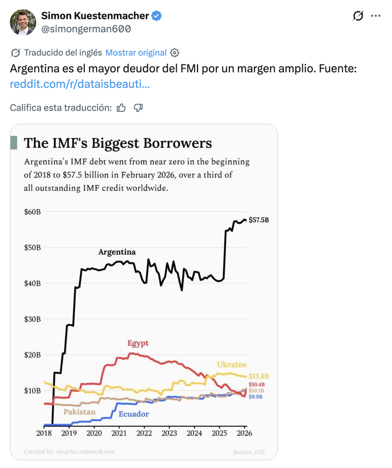 «El mercado lo precia más arriba porque tiene en cuenta el pasado argentino, un país que tuvo nueve defaults, le sacó tres ceros a su moneda, tuvo dos hiperinflaciones», añadió. Esto también es cierto, pero más aun lo es que los fondos privados miran más al futuro que al pasado y que, si observan la presencia de un acreedor institucional privilegiado por montos tan altos, es natural que no descarten la eventualidad de una nueva cesación de pagos o de renegociación de vencimientos y se resistan a apostar por deuda soberana argentina.
